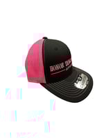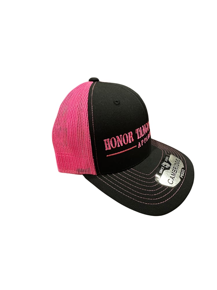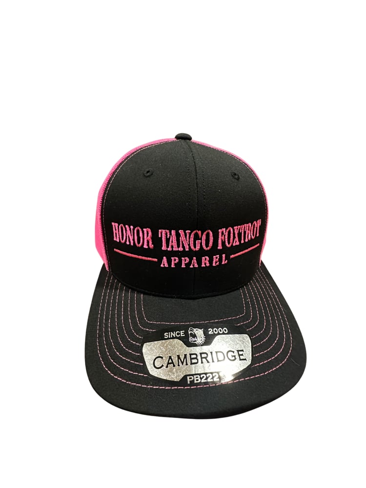 The Pink Strike Trucker combines a black tactical crown with high-visibility pink mesh and matching stitchwork, creating a sharp contrast that hits hard whether you’re on the range, on shift, or repping HTF in your daily grind.
